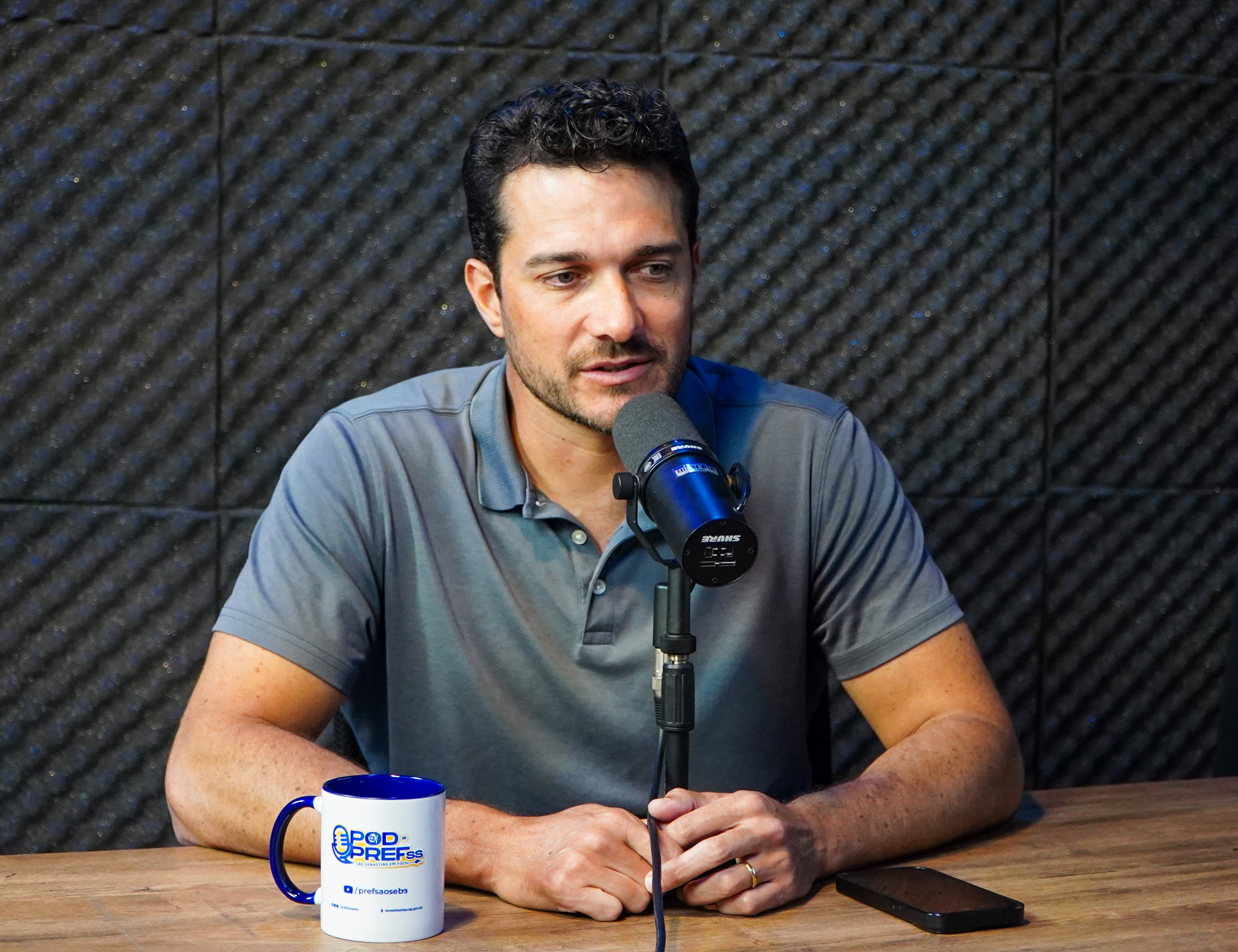 #PratodosVerem: durante a gravação do Pod da PrefSS, o secretário de Esportes de São Sebastião, Ubiratan Mourão, participa de uma conversa descontraída com o apresentador Rafael César. Sentados frente a frente em uma mesa de madeira, os dois estão posicionados diante de microfones profissionais, com canecas personalizadas do podcast e o logo do programa exibido em uma tela ao fundo. Fim da descrição.