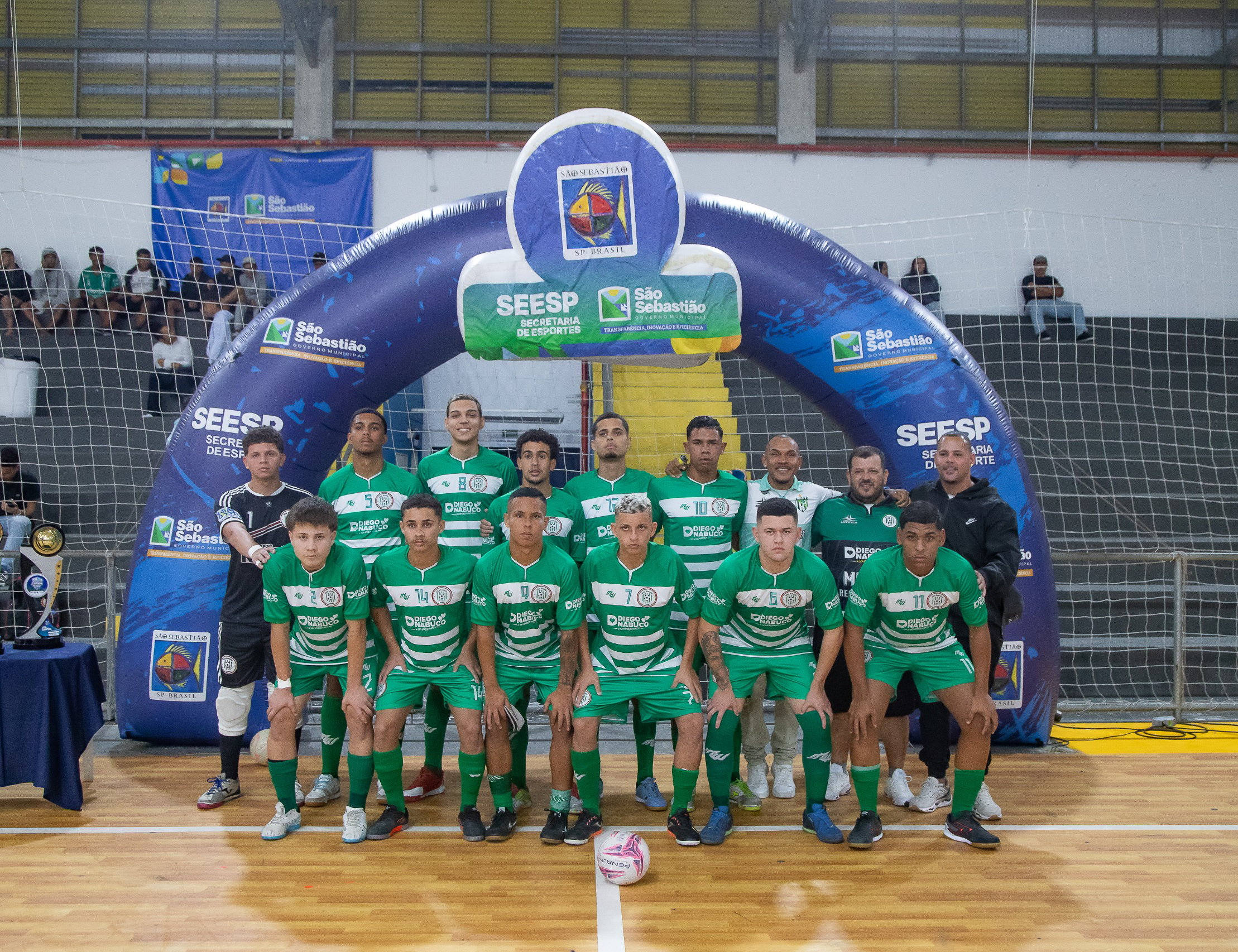 #PraTodosVeram: as imagens retratam momentos marcantes da decisão da final da 15ª Copa Sebastianense de Futsal Sub-18. Os registros mostram a intensidade do jogo com lances de ataque, marcação e cobranças de falta, além do clima de união entre as equipes. A equipe vestida de verde posa para a tradicional foto oficial antes da final, enquanto os jogadores do time de branco celebram a conquista do título erguendo o troféu com muita empolgação. A Arena Esportiva Amaro Buarque Sampaio, decorada com banners da Secretaria de Esportes (Seesp), foi palco de mais uma competição emocionante promovida no município. Fim da descrição.