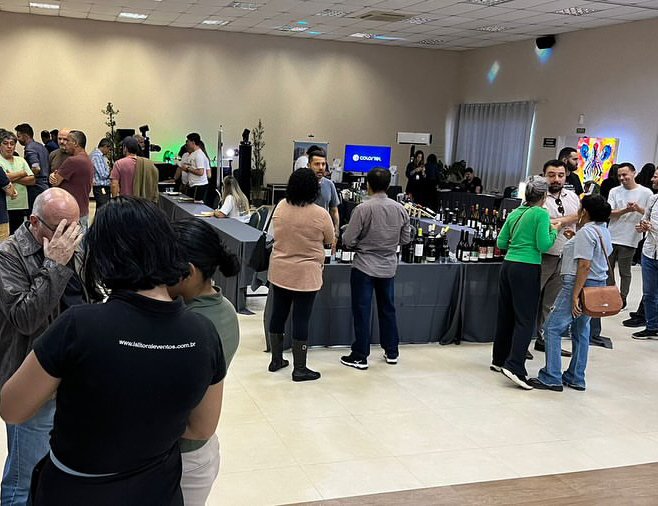 #PraTodosVerem: salão amplo e iluminado recebe evento com a presença de expositores e visitantes. Várias mesas estão organizadas com produtos em exposição, como vinhos e itens de gastronomia. Pessoas circulam, conversam e interagem com os expositores. A decoração inclui iluminação cênica, balões coloridos e plantas ornamentais, criando um ambiente descontraído e acolhedor. Ao fundo, há equipamentos de som e DJs animando o espaço. Fim da descrição.