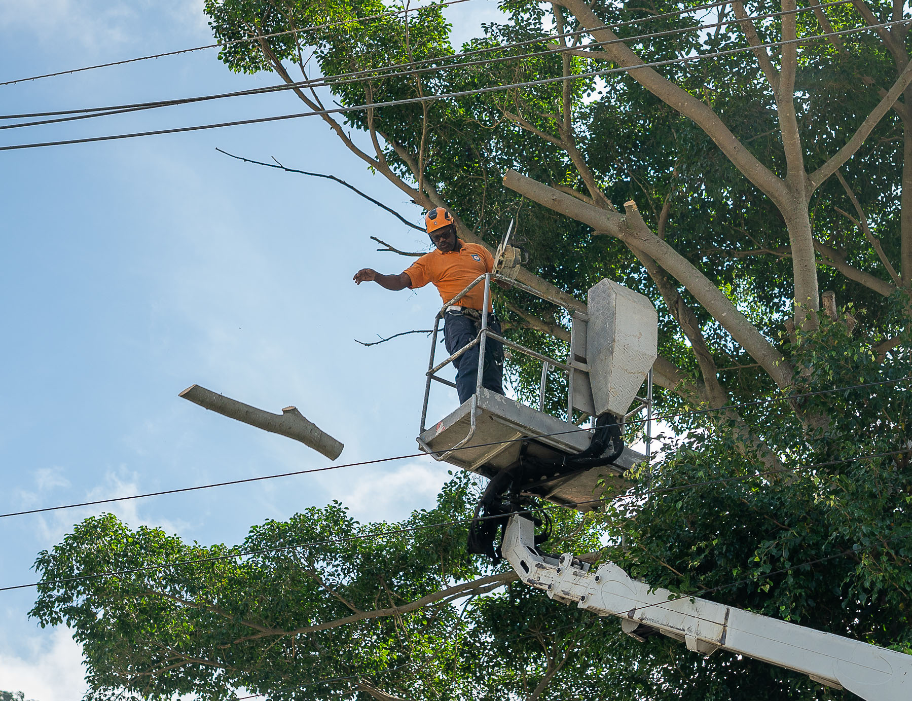 #PraTodosVerem: Em uma rua residencial, agentes da Defesa Civil de São Sebastião, em São Paulo, realizam o corte e a poda de galhos de uma grande árvore próxima à fiação elétrica. Um homem com uniforme laranja e capacete branco organiza os trabalhos em solo, enquanto outro, sobre uma plataforma elevatória acoplada a um caminhão, corta os galhos altos e remove partes da árvore. No chão, há folhas e galhos espalhados. Ao fundo, aparecem casas simples e um pequeno comércio com uma parede amarela. A ação acontece em um dia claro e ensolarado. Fim da descrição.
