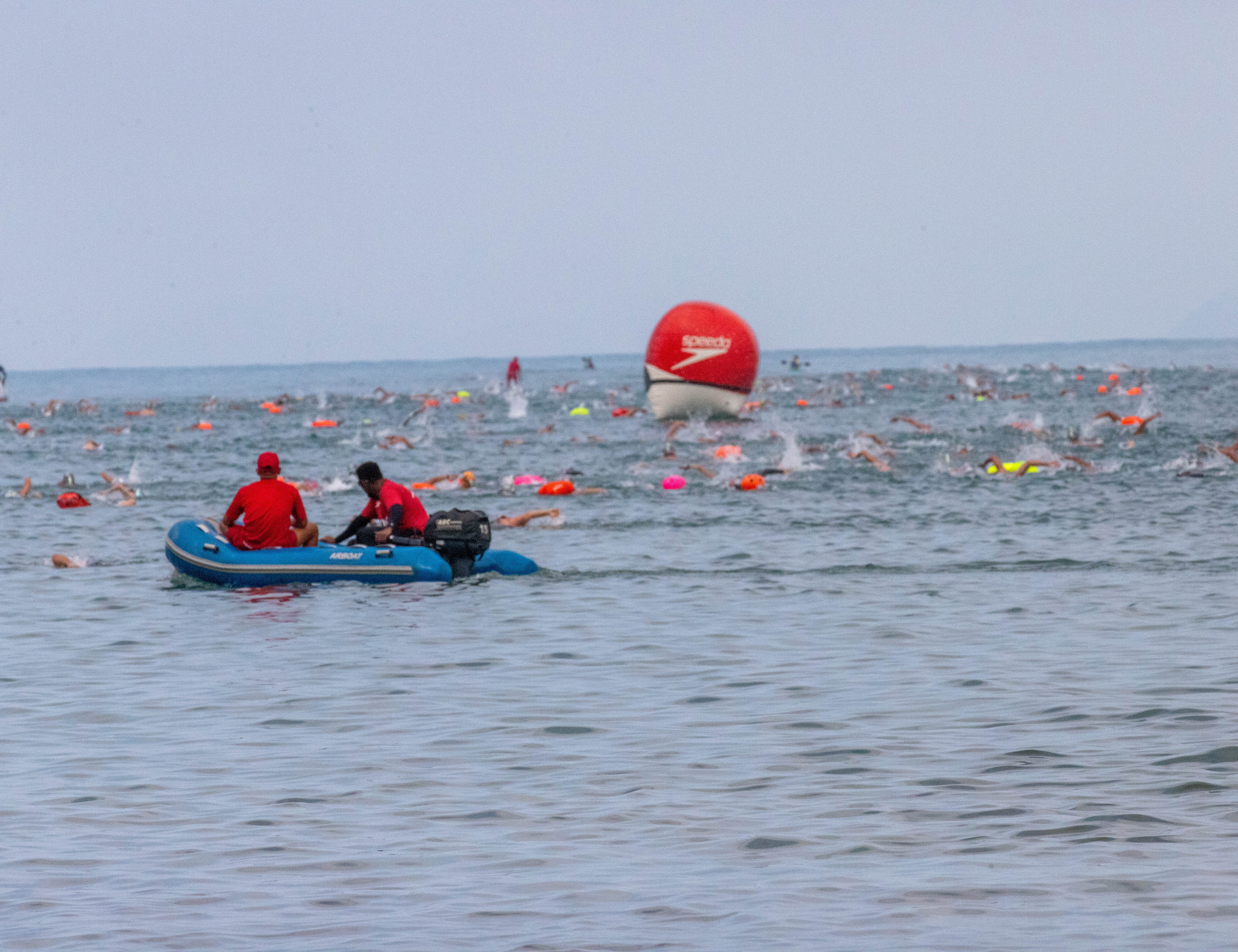 #PraTodosVerem: As três imagens retratam uma competição de natação em águas abertas, possivelmente a "Travessia Poliana Okimoto", em um dia nublado. As duas primeiras fotos mostram a prova no mar, com um grande número de nadadores na água, alguns usando toucas de natação amarelas; a primeira imagem exibe um bote salva-vidas inflável azul com dois socorristas de camisa vermelha observando o grupo, e uma grande boia de sinalização vermelha e branca à direita. A terceira imagem foca na areia da praia, onde um atleta (homem de camiseta regata azul escura e boné) corre após sair da água ou ao final da prova, sendo observado por uma multidão de espectadores em pé, e ao fundo há tendas de apoio, incluindo uma laranja e azul com o logo "WATERSIDE". Fim da descrição.