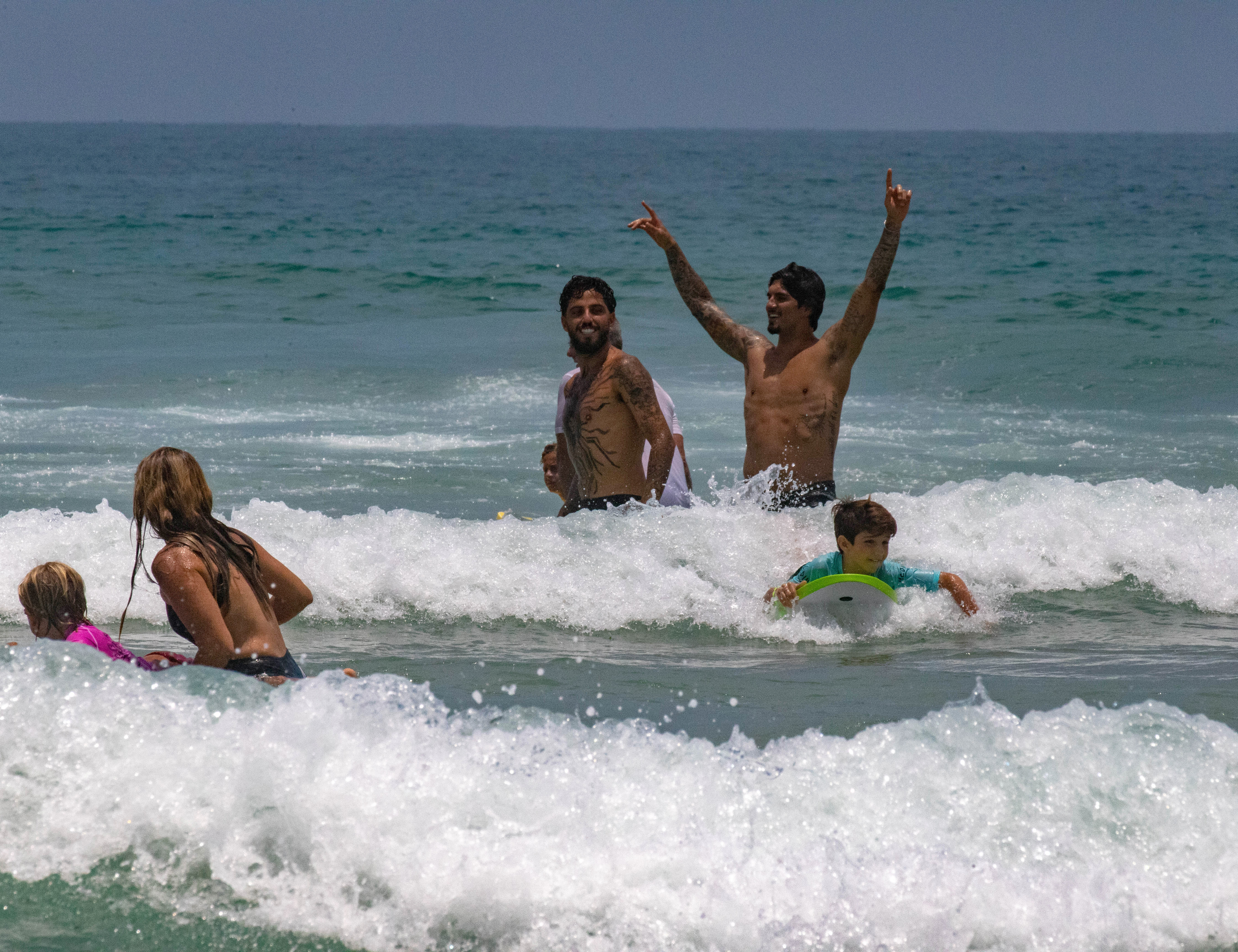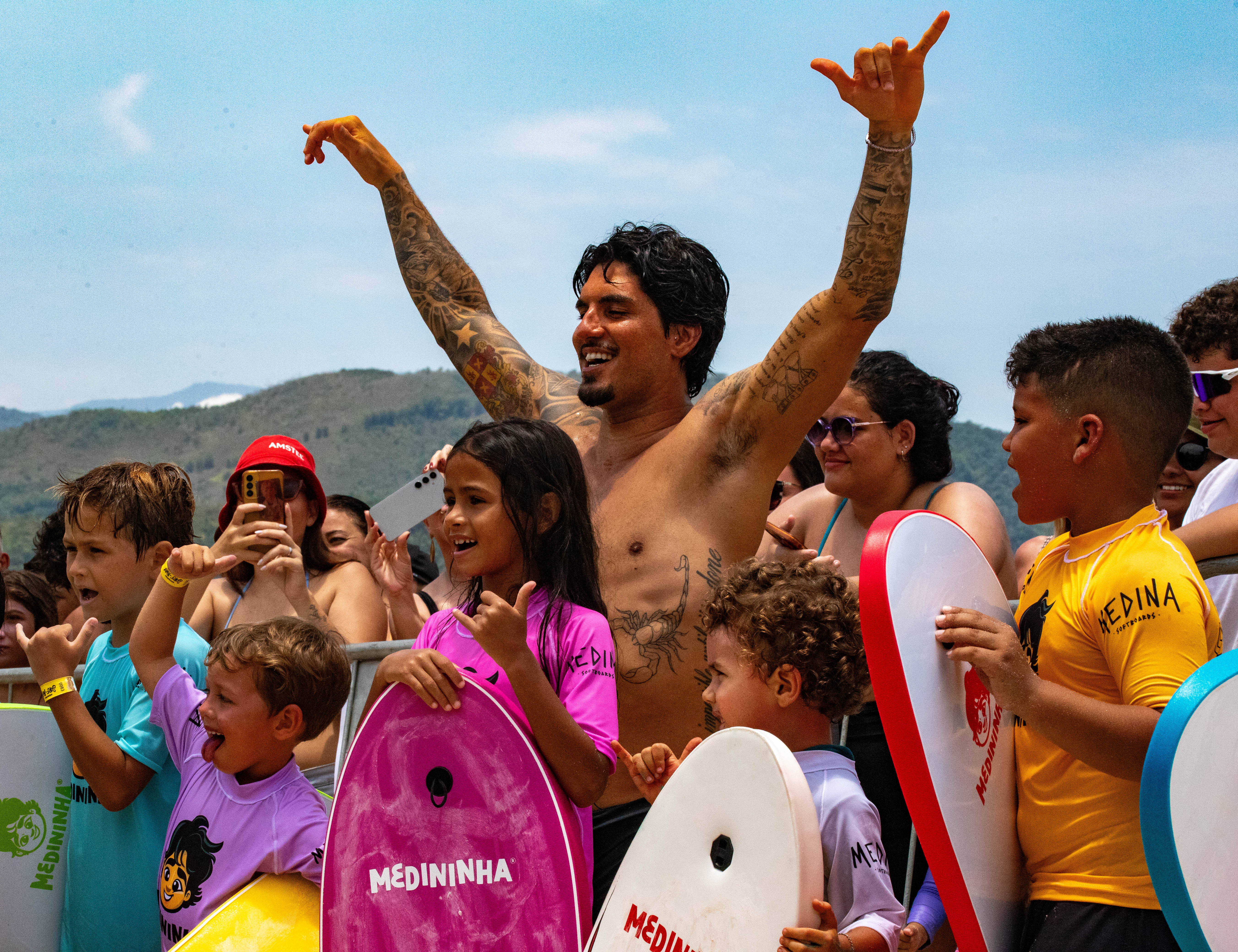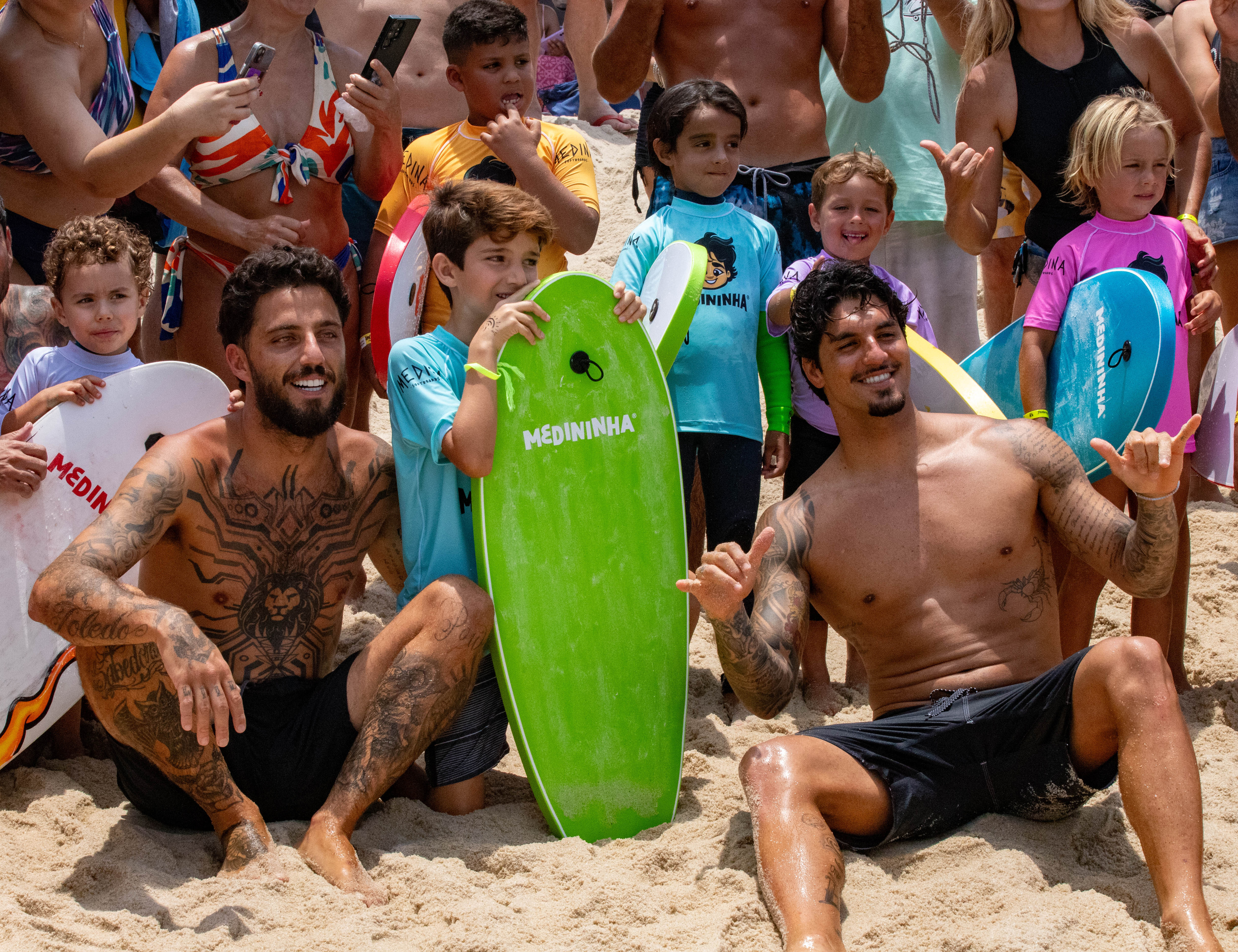 #PraTodosVerem: As imagens registram momentos de alegria e integração durante o Medininha Surf Day, com Gabriel Medina interagindo de forma descontraída com as crianças na areia, posando para fotos ao lado dos pequenos atletas com suas pranchas coloridas e celebrando dentro d’água enquanto os participantes se divertem nas ondas; em outra cena, o mascote oficial do evento surge cercado por um grande grupo de crianças e adultos que vibram e registram o momento, destacando o clima festivo, comunitário e de incentivo ao esporte que marcou a atividade em Maresias. Fim da descrição.