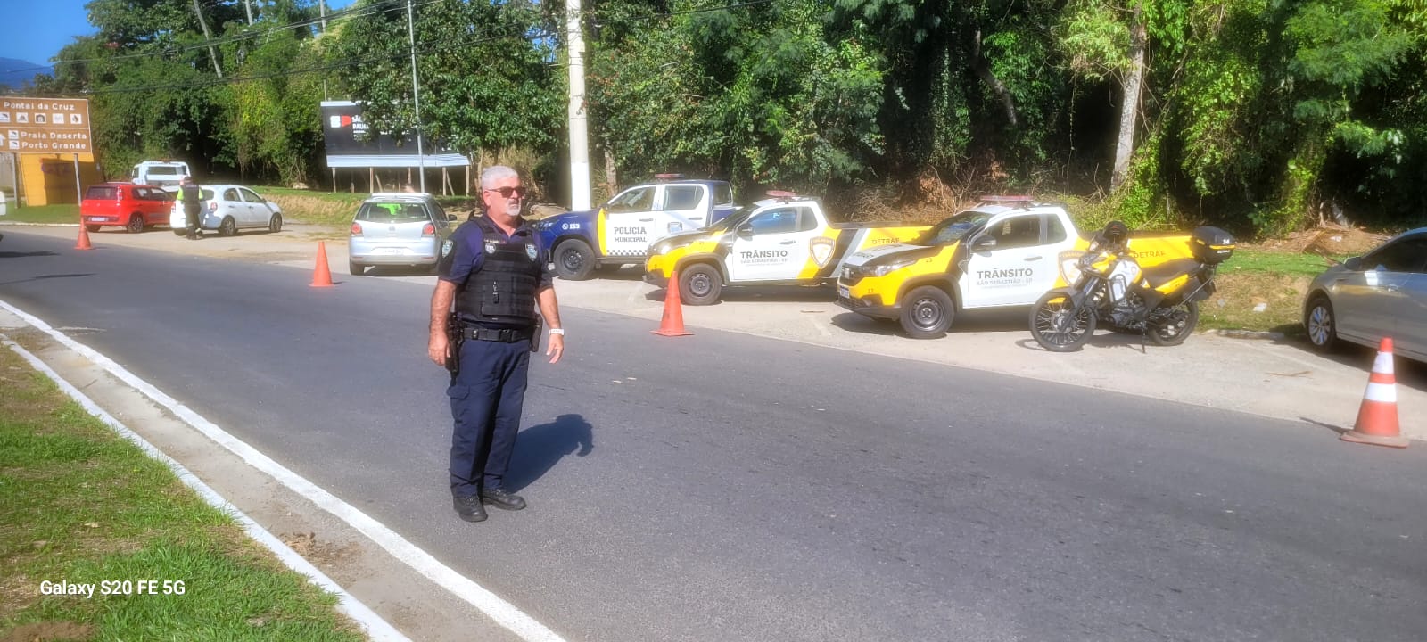 #PraTodosVerem: As imagens mostram uma operação de fiscalização de trânsito em São Sebastião-SP, realizada durante o dia em uma via asfaltada com faixa branca na lateral. Cones laranjas estão posicionados delimitando o local da fiscalização. Nas imagens aparecem viaturas e motocicleta do Departamento de Trânsito (DETRAF), com cores branca e amarela, e também uma viatura azul da Polícia Municipal. Agentes de trânsito, com uniformes em tons fluorescentes e escuros, e policiais municipais estão realizando a abordagem de veículos, orientando motoristas e conferindo documentos. Ao fundo há vegetação densa, placas indicativas com destinos turísticos e montanhas azuladas no horizonte sob céu claro.