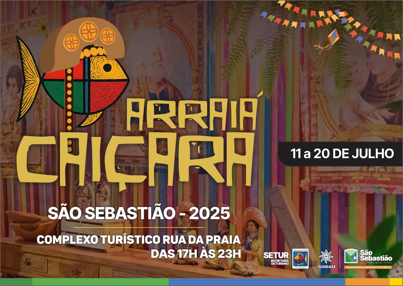 #PraTodosVerem: arte gráfica colorida do evento ‘Arraiá Caiçara’. Ao centro, há um peixe estilizado com chapéu de cangaceiro. O texto informa: ‘Arraiá Caiçara – São Sebastião 2025, de 11 a 20 de julho, no Complexo Turístico Rua da Praia, das 17h às 23h’. Imagens de bolinho caipira e torresmo. Imagem de muitas pessoas sentada e em pé, na Tenda do Arraiá. Fim da descrição.