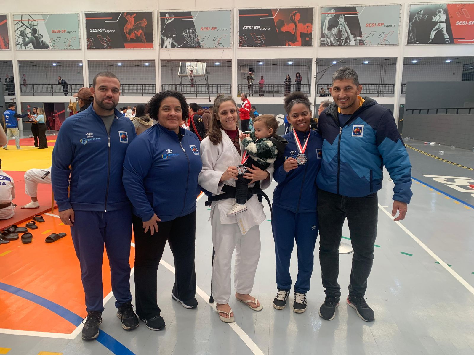#PraTodosVerem: Atletas e técnicos de judô de São Sebastião posam sorridentes durante a participação nos Jogos Regionais, celebrando o espírito de equipe e as conquistas na competição. As imagens mostram momentos de união e orgulho, com destaque para duas judocas medalhistas exibindo suas conquistas ao lado da equipe técnica, incluindo uma atleta que segura uma criança no colo. Em outra cena, cinco atletas da equipe feminina, todas com quimonos azuis, posam lado a lado no tatame, demonstrando camaradagem e foco. A equipe completa também é registrada reunida para uma foto oficial, com homens e mulheres organizados em duas fileiras, transmitindo o sentimento de pertencimento e superação que o judô proporciona. Fim da descrição.