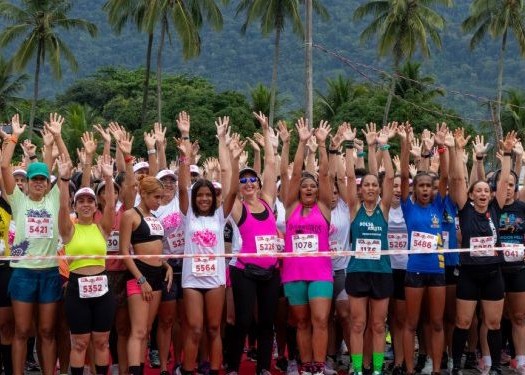 #PraTodosVerem: Centenas de mulheres participam do Circuito Mais Mulher ao ar livre cercada por coqueiros e montanhas, levantando os braços com entusiasmo na largada. Em outro momento, participantes recebem atendimento de massoterapeutas em uma tenda de recuperação, reforçando o clima de bem-estar e cuidado. As imagens também mostram corredoras cruzando a linha de chegada com alegria e superação, celebrando o esforço e a energia positiva do evento, que une esporte, saúde e empoderamento feminino. Fim da descrição.
