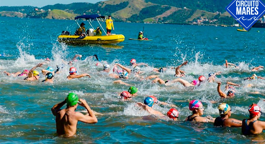 #PraTodosVerem: imagens de edições do Circuito Mares que reúne provas de Maratona Aquática, Aquathlon e corrida. Fim da descrição.